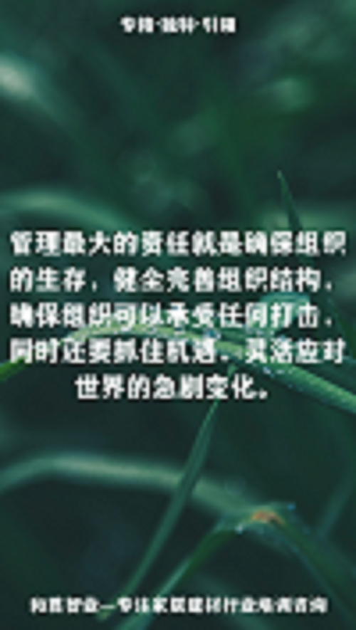 北京和君智業(yè)教育科技有限公司總經(jīng)理 2022中國百強講師 大商公司化運營專業(yè)顧問 資深實戰(zhàn)派講師 戰(zhàn)略營銷語錄:確保組織生存!管理最大的責任就是確保組織的生存,健全完善組織結(jié)構(gòu),確保組織可以承受任何打擊,同時還要抓住機遇,靈活應對世界急劇變化。