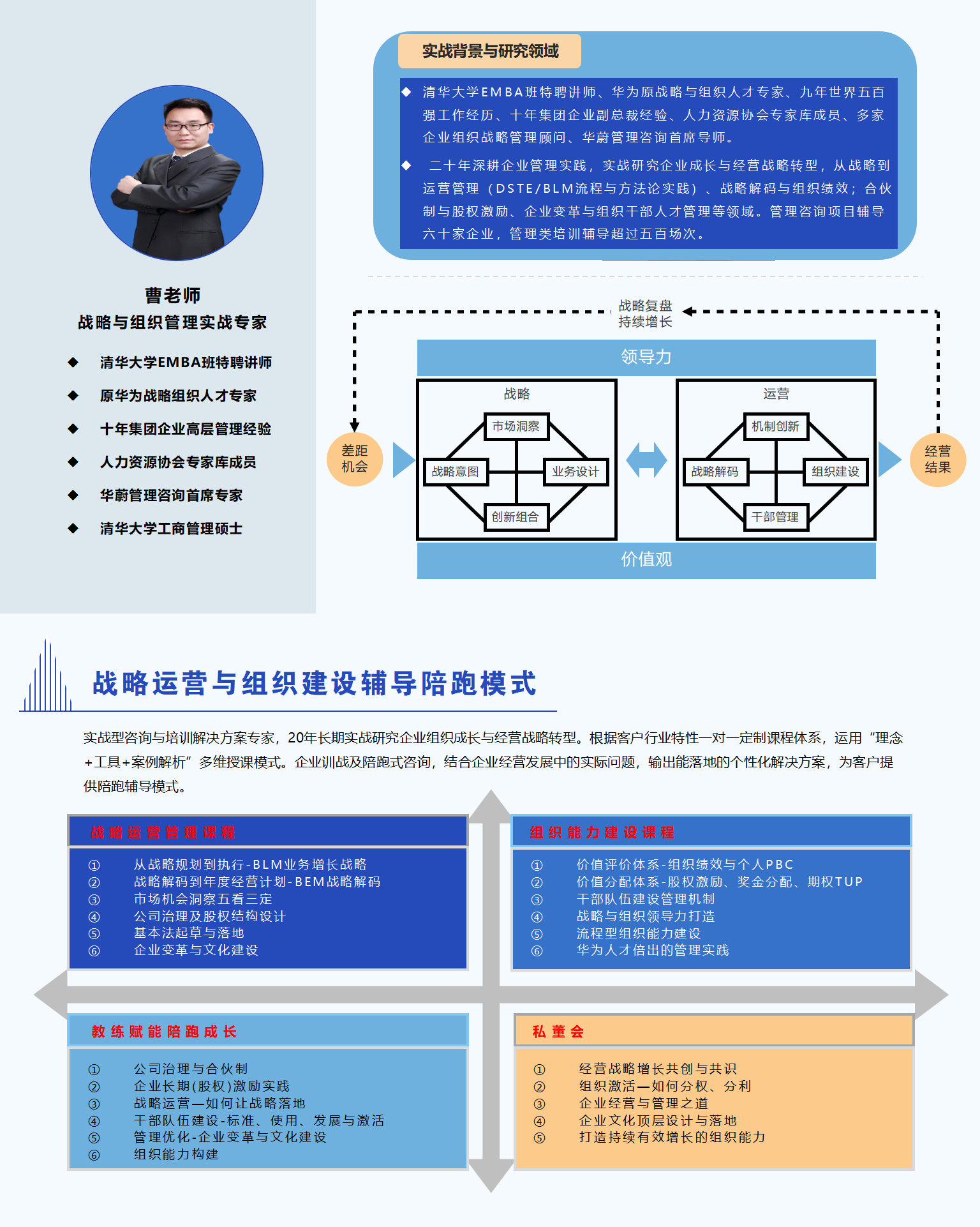 曹揚老師,戰(zhàn)略與組織力領(lǐng)域的實戰(zhàn)專家,清華大學(xué)EMBA特聘講師,著有《破局:華為戰(zhàn)略與組織的共生進化》,并擔(dān)任人力資源協(xié)會專家?guī)斐蓡T。他擁有15年全球五百強及港股企業(yè)集團副總裁的豐富實戰(zhàn)經(jīng)驗,曾任職于全球五百強企業(yè),擔(dān)任戰(zhàn)略與組織專家。曹揚老師專注于經(jīng)營戰(zhàn)略和組織力領(lǐng)域已達25年,為企業(yè)提供戰(zhàn)略..