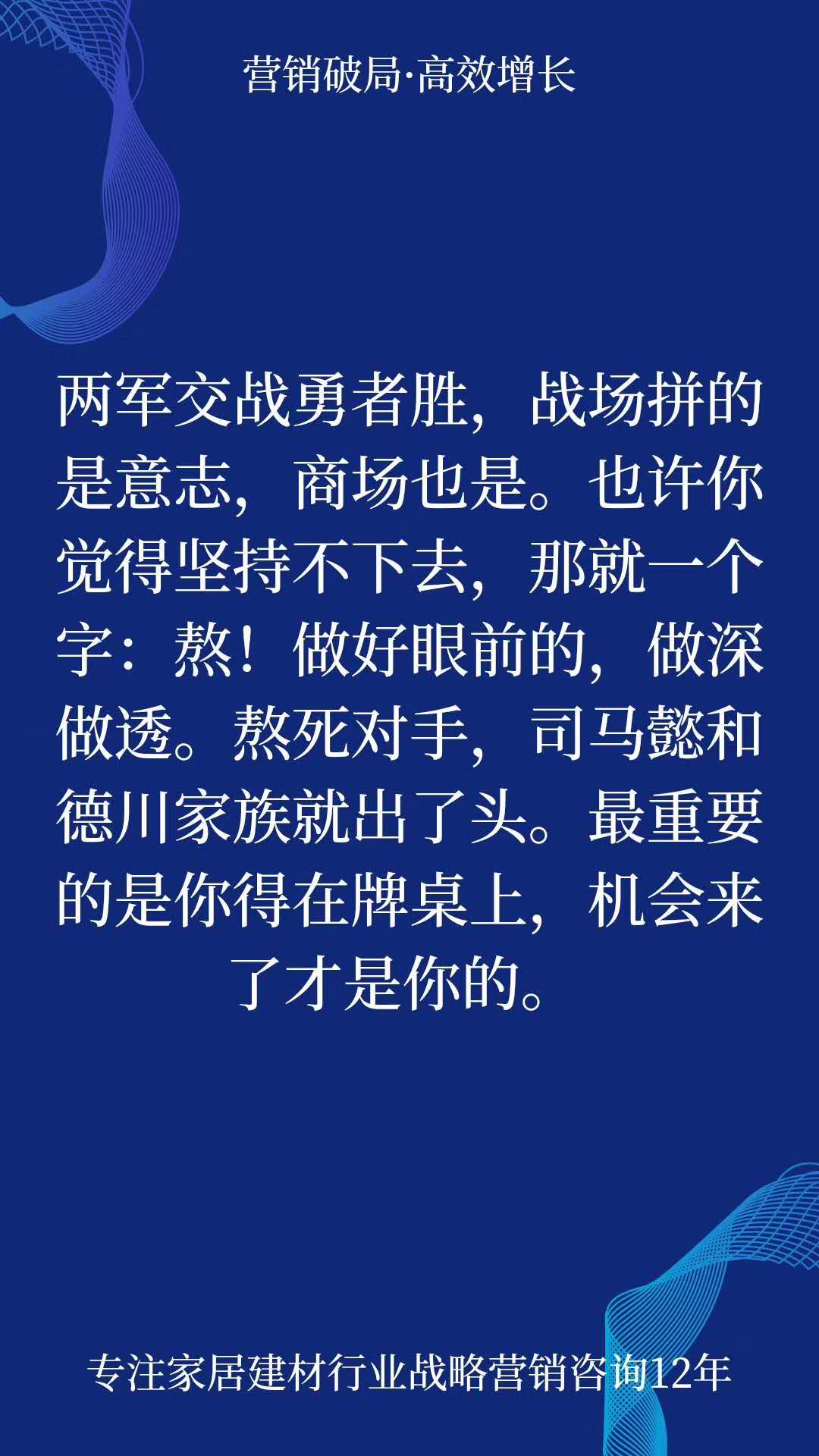 兩軍交戰(zhàn)勇者勝,戰(zhàn)場拼的是意志,商場也是。 也許你覺得堅持不下去,那就一個字:熬!做好眼前的,做深做透。熬死對手,司馬懿和德川家族就出了頭。 最重要的是你得在牌桌上,機(jī)會,來了才是你的。 ![]() 【怕停滯,找登榜,戰(zhàn)略營銷助增長!】
