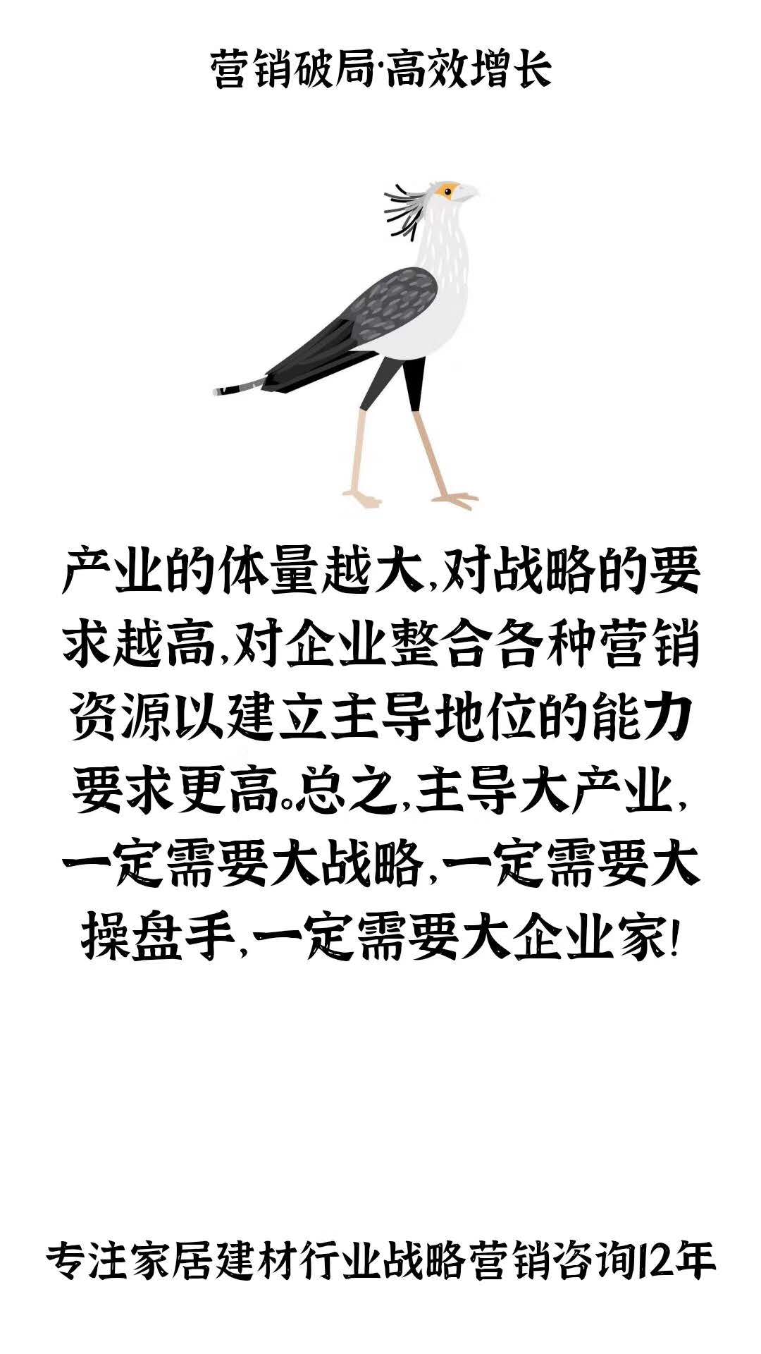 產(chǎn)業(yè)的體量越大,對(duì)戰(zhàn)略的要求越高,對(duì)企業(yè)整合各種營(yíng)銷資源以建立主導(dǎo)地位的能力要求更高。 總之,主導(dǎo)大產(chǎn)業(yè),一定需要大戰(zhàn)略,一定需要大操盤手,一定需要大企業(yè)家!