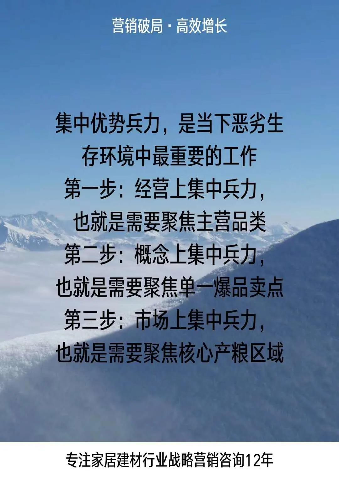 專注家居建材行業(yè)戰(zhàn)略營銷咨詢12年 北京和君智業(yè)教育科技有限公司總經(jīng)理 中國家居建材行業(yè)戰(zhàn)略營銷研究中心發(fā)起人 大商公司化運營專業(yè)顧問 資深實戰(zhàn)派講師 戰(zhàn)略營銷語錄:順勢而為!集中優(yōu)勢兵力,是當下惡劣生存環(huán)境中最重要的工作: 第一步:經(jīng)營上集中兵力,也就是需要聚焦主營品類; 第二步:概念上集中兵力,也就是需要聚焦單一爆品賣點; 第三步:市場上集中兵力,也就是需要聚焦核心產(chǎn)糧區(qū)域。