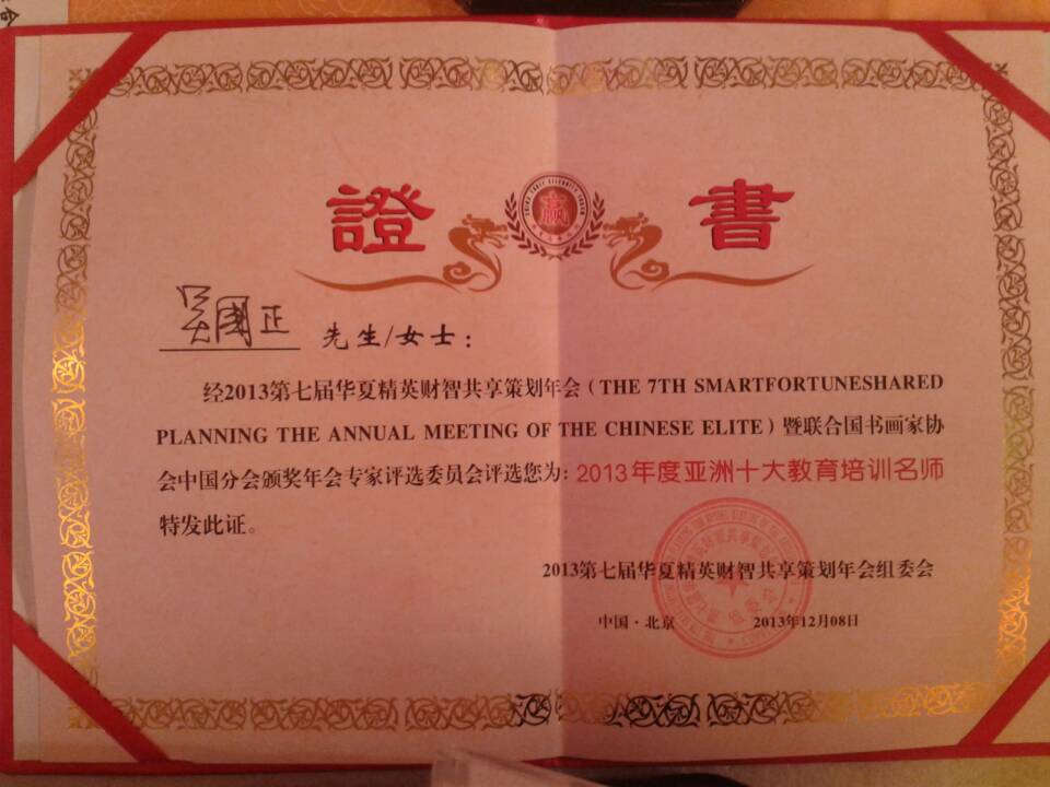 吳國正老師 榮獲2013年亞洲十大教育培訓(xùn)名師