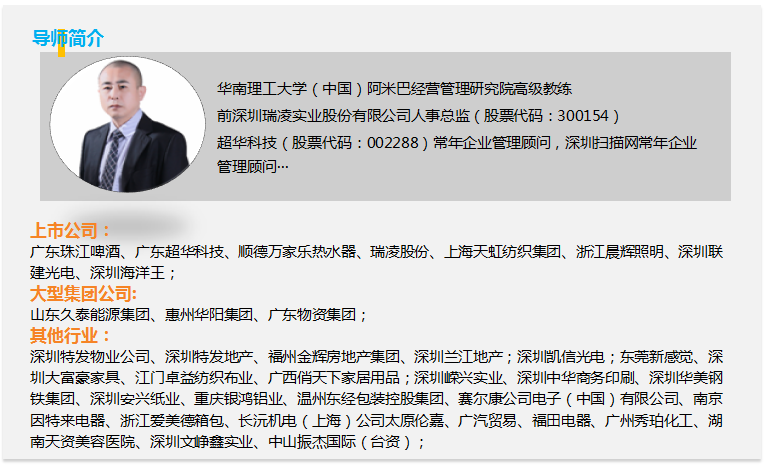 譚文平 —— 企業(yè)利潤(rùn)倍增系統(tǒng)打造管理專家 中國(guó)員工動(dòng)力系統(tǒng)第1人 華南理工大學(xué)—阿米巴(中國(guó))研究中心高級(jí)教練 曾任職瑞凌股份HRD(股票代碼:300154) 曾任職深圳市富安娜家居用品股份有限公司人力資源高管(股票代碼:002327) 曾任職深圳..