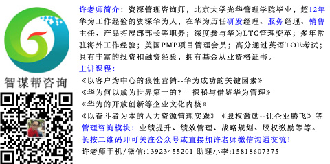 許浩明老師的簡(jiǎn)單介紹: 1、北京大學(xué)光華管理學(xué)院畢業(yè)、近十三年華為管理實(shí)戰(zhàn)經(jīng)驗(yàn);北大光華碩士論文是《華為管理實(shí)踐》方面的課題,對(duì)華為管理進(jìn)行深入研究,而且有豐富華為管理實(shí)戰(zhàn)經(jīng)驗(yàn)。 2、在華為三大核心體系都奮斗歷練過的前華為部長(zhǎng);曾在華為獲“華為金牌團(tuán)隊(duì)獎(jiǎng)”&ldquo..