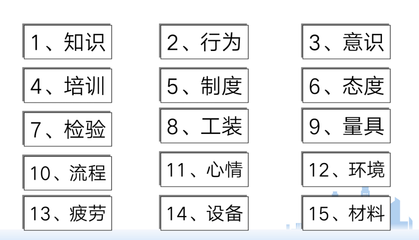 如果不能顯示圖片內(nèi)容,則可閱讀以下等同圖片的詞語(yǔ)內(nèi)容。 1、知識(shí);2、行為;3、意識(shí);4、培訓(xùn);5、制度;6、態(tài)度;7、檢驗(yàn);8、工裝;9、量具;10、流程;11、心情;12、環(huán)境;13、疲勞;14、設(shè)備;15、材料。 |