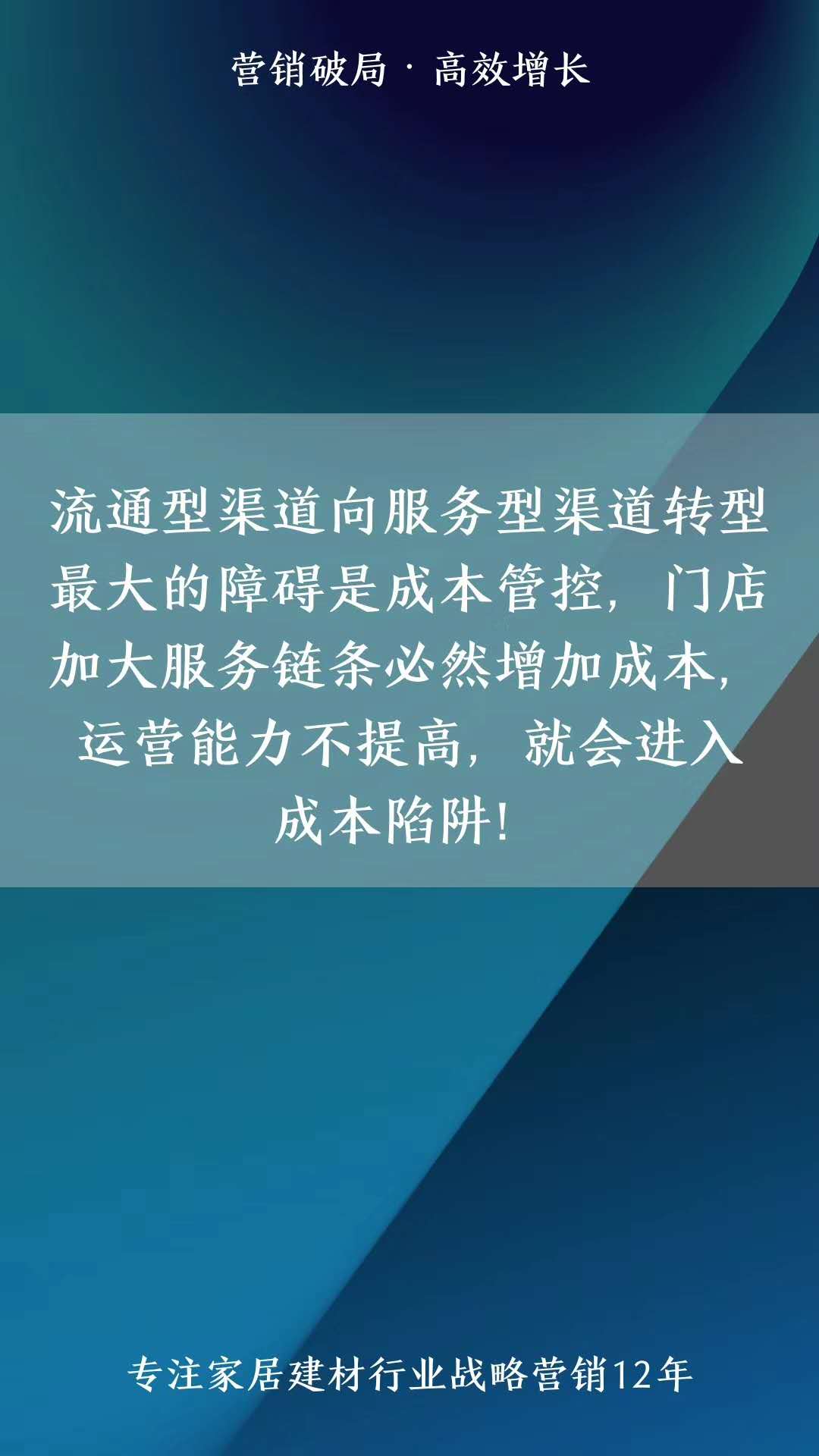 劉登榜 專注家居建材行業(yè)戰(zhàn)略營(yíng)銷咨詢12年 北京和君智業(yè)教育科技有限公司總經(jīng)理 中國家居建材行業(yè)戰(zhàn)略營(yíng)銷研究中心發(fā)起人 大商公司化運(yùn)營(yíng)專業(yè)顧問 資深實(shí)戰(zhàn)派講師 戰(zhàn)略營(yíng)銷語錄:成本陷阱! 流通型渠道向服務(wù)型渠道轉(zhuǎn)型最大的障礙是成本管控,門店加大服務(wù)鏈條必然增加成本,運(yùn)營(yíng)能力不提高,就會(huì)陷入成本陷阱!
