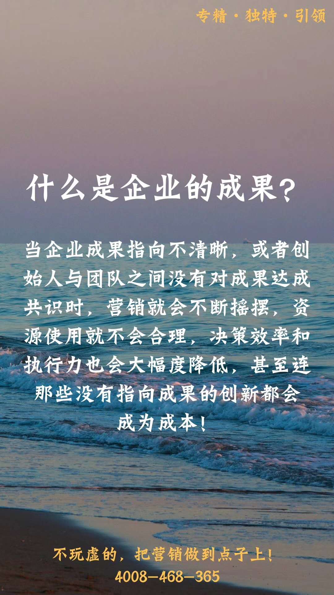 北京和君智業(yè)教育科技有限公司總經(jīng)理 中國家居建材行業(yè)戰(zhàn)略營銷研究中心發(fā)起人 大商公司化運營專業(yè)顧問 資深實戰(zhàn)派講師 戰(zhàn)略營銷語錄:成果導(dǎo)向!什么是企業(yè)的成果? 當企業(yè)成果指向不清晰,或者創(chuàng)始人與團隊之間沒有對成果達成共識時,營銷就會不斷搖擺,資源使用就不會合理,決策效率和執(zhí)行力也會大幅度降低,甚至連那些沒有指向成果的創(chuàng)新都會成為成本!