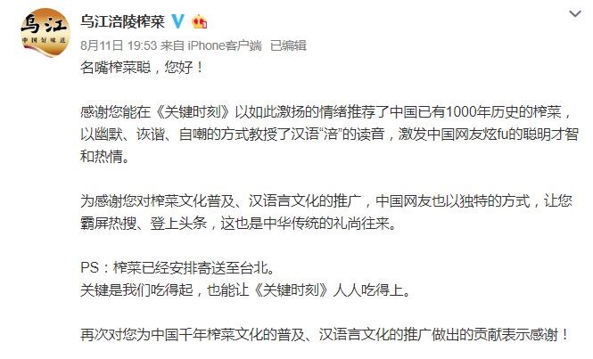 子淳也一直關注灣灣,兩岸統(tǒng)一是潮流。 大陸吃不起茶葉蛋,買不起榨菜的鬧劇,只能說某些帶毒分子,中毒太深,入戲太足,蚍蜉撼大樹,可笑不自量! 涪陵榨菜給臺灣財經(jīng)“磚家”黃世聰寄了一整箱榨菜,這個事件營銷很智慧! 寫完此文,去超市買榨菜去,耶!