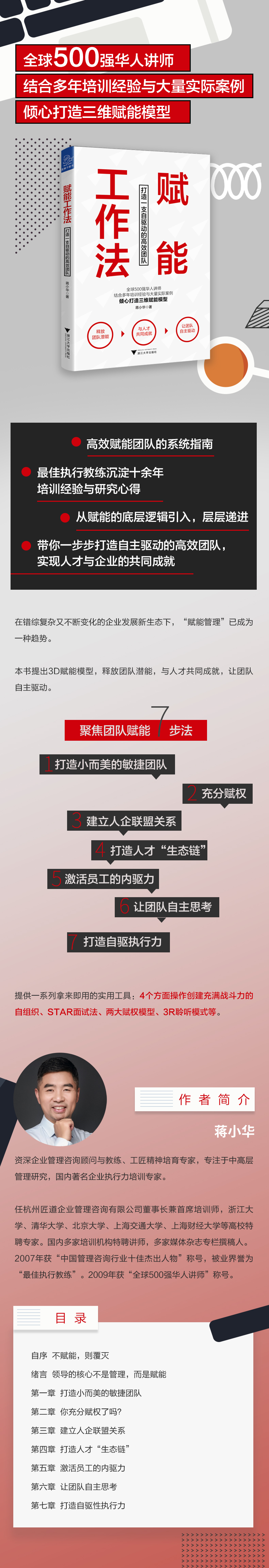 我曾問過無數(shù)的團(tuán)隊(duì)管理者,他們管理中的最大痛點(diǎn)是什么?結(jié)果收到的回答中最多的是,企業(yè)缺少優(yōu)秀的人才,員工缺乏足夠的能力和動力。 情況真是這樣嗎?我通過10 多年的企業(yè)管理研究和實(shí)踐,驚訝地發(fā)現(xiàn),企業(yè)并不是缺人才,而是缺乏管理人才的賦能力;員工也不是缺能力,而是缺乏釋放能力的驅(qū)動力。 正如任正非說,企業(yè)的核心競爭力不是人才,而是管理人才的能力。任正非所說的人才管理能力,其本質(zhì)就是對人才賦能。尤其是在不確定性因素很多的今天,這一點(diǎn)尤為明顯,甚至可以毫不夸張地說,“不賦能,則覆滅”。 阿里巴巴集團(tuán)學(xué)術(shù)委員會主席、湖畔大學(xué)教育長曾鳴也指出,未來企業(yè)的核心功能不是管理,而是賦能。在錯(cuò)綜復(fù)雜的社會環(huán)境下,企業(yè)管理的關(guān)鍵已從控制命令式轉(zhuǎn)變?yōu)橘x能分布式。 何謂賦能?賦是賦予,能是權(quán)力、能力和動力,連起來就是賦予團(tuán)隊(duì)權(quán)力、動力和能力,讓團(tuán)隊(duì)自主決策和自主驅(qū)動。很多時(shí)候,企業(yè)一著慢,滿盤輸。正如普希爾定律所說:再好的決策也經(jīng)不起拖延。只有懂得賦能的組織或個(gè)人,才可能擁有強(qiáng)大的、能快速反應(yīng)的團(tuán)隊(duì)。 賦能的概念起源于20 世紀(jì)20 年代,提出者是被德魯克稱為“管理學(xué)的先知”,人稱“管理理論之母”的現(xiàn)代管理學(xué)理論預(yù)言家瑪麗·帕克·福萊特。她嚴(yán)厲地批判了等級森嚴(yán)的企業(yè)組織結(jié)構(gòu),非常反對“命令與控制”型的管理作風(fēng),倡導(dǎo)民主的管理方式,認(rèn)為決策時(shí)應(yīng)充分考慮基層員工的經(jīng)驗(yàn)和知識。 那時(shí)候,賦能對個(gè)體而言更多的是一種激勵,但激勵應(yīng)視作賦能在工業(yè)時(shí)代的前身,而賦能在信息時(shí)代是對激勵的升級和優(yōu)化,是激發(fā)員工的潛能,讓團(tuán)隊(duì)自主決策,以應(yīng)對外界的變化,且讓團(tuán)隊(duì)自我驅(qū)動,打造敏捷團(tuán)隊(duì)的最好的良方。 另外,賦能是要“創(chuàng)造”更多優(yōu)秀的人才,與人才共同成就。賦能領(lǐng)導(dǎo)者總是把精力投入到如何提取與延伸他人的才能之中,他們不炫耀自己的智力,不滿足于眼前的利益,而關(guān)注長遠(yuǎn)的發(fā)展。也就是說,他們從員工那里得到的比員工自己知道的還要多。 研究發(fā)現(xiàn),一般的領(lǐng)導(dǎo)者,只能讓員工發(fā)揮20%~50% 的能力,而賦能領(lǐng)導(dǎo)者通常能讓員工發(fā)揮70%~100% 的能力,這兩者相差約2倍。如果我們能得到現(xiàn)在團(tuán)隊(duì)雙倍的才能,那么還有什么做不到的目標(biāo)呢? 為什么賦能領(lǐng)導(dǎo)者可以挖掘出員工更多的能力?因?yàn)樗麄兿嘈艈T工很聰明,有能力解決問題,而且他們相信員工可以在更高的水平上做出貢獻(xiàn)。他們會不斷地問自己:這個(gè)人的優(yōu)點(diǎn)是什么?我可以做些什么能更好地發(fā)揮他的優(yōu)點(diǎn)呢? 《高效能人士的七個(gè)習(xí)慣》一書的作者史蒂芬·柯維說:“如果每一位領(lǐng)導(dǎo)者都從限制團(tuán)隊(duì)發(fā)展的領(lǐng)導(dǎo)向賦能領(lǐng)導(dǎo)者邁進(jìn)一步,社會將會如何變化呢?”目前,企業(yè)內(nèi)部有許多沒有挖掘的人力資源,相反還削弱了員工的智慧。 為此,我進(jìn)行了深入的探索和研究,試著整理出一個(gè)框架和體系,給讀者,特別是給從事團(tuán)隊(duì)工作的領(lǐng)導(dǎo)們提供一套“地圖”。 本書的緒言部分,主要闡述從傳統(tǒng)管理到領(lǐng)導(dǎo)賦能的思維轉(zhuǎn)變,并構(gòu)建釋放團(tuán)隊(duì)潛能、與人才共同成就和讓團(tuán)隊(duì)自主驅(qū)動的三維賦能模型。全書共分3 部分進(jìn)行系統(tǒng)闡述。 第一部分,主要闡述如何解放團(tuán)隊(duì)束縛,釋放團(tuán)隊(duì)潛能。一是從組織架構(gòu)上加以精簡和扁平化,并創(chuàng)造協(xié)同文化;二是從有效賦權(quán)的角度,放權(quán)釋能,從而打造一支小而美的敏捷團(tuán)隊(duì)。 第二部分,主要闡述如何讓團(tuán)隊(duì)與人才共同成就。該部分通過重新定義人與企業(yè)的關(guān)系、找到合適的人才、創(chuàng)造人才最大合力、穩(wěn)固聯(lián)盟關(guān)系、培養(yǎng)和打造卓越人才等,構(gòu)建相互成就的人才生態(tài)鏈。 第三部分,主要闡述如何讓團(tuán)隊(duì)自主驅(qū)動。該部分分別從激發(fā)團(tuán)隊(duì)的內(nèi)驅(qū)力、讓團(tuán)隊(duì)自主思考和打造自驅(qū)性執(zhí)行力的角度,提煉一套團(tuán)隊(duì)自驅(qū)體系。 可以說,這是一本關(guān)于團(tuán)隊(duì)賦能比較成體系的書,希望本書能給讀者梳理出賦能的框架和行動攻略,從而可以輕松地打造出一支自驅(qū)動的敏捷團(tuán)隊(duì)。