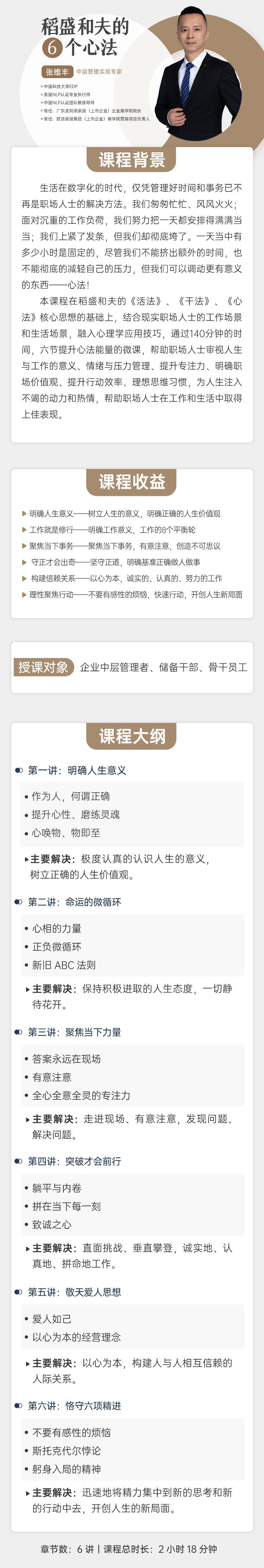 本課程在稻盛和夫的《活法》、《干法》、《心法》核心思想的基礎(chǔ)上,結(jié)合現(xiàn)實(shí)職場人士的工作場景和生活場景,融入心理學(xué)應(yīng)用技巧,通過140分鐘的時(shí)間,六節(jié)提升心法能量的微課,幫助職場人士審視人生與工作的意義、情緒與壓力管理、提升專注力、明確職場價(jià)值觀、提升行動(dòng)效率、理想思維習(xí)慣,為人生注入不竭的動(dòng)力和熱情,幫助職場人士在工作和生活中取得上佳表現(xiàn)。
