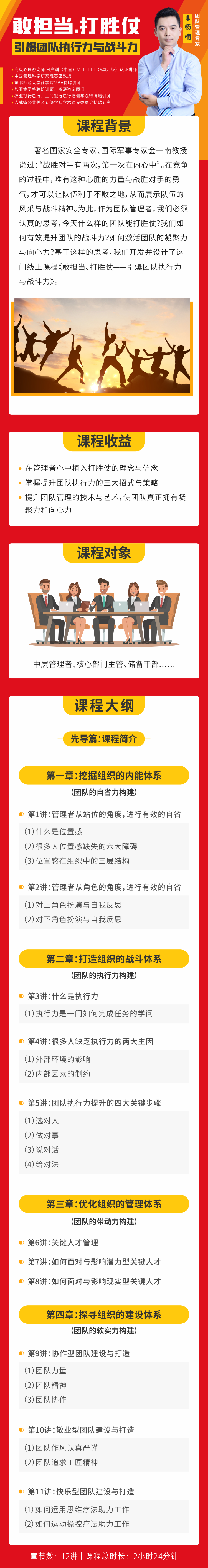 著名國家安全專家、國際軍事專家金一南教授說過:“戰(zhàn)勝對手有兩次,第一次在內(nèi)心中”。在競爭的過程中,唯有這種心勝的力量與戰(zhàn)勝對手的勇氣,才可以讓隊伍利于不敗之地,從而展示隊伍的風(fēng)采與戰(zhàn)斗精神。為此,作為團隊管理者,我們必須認真的思考,今天什么樣的團隊能打勝仗?我們?nèi)绾斡行嵘龍F隊的戰(zhàn)斗力?如何激活團隊的凝聚力與向心力?基于這樣的思考,我們開發(fā)并設(shè)計了這門線上課程《敢擔(dān)當(dāng)、打勝仗——引爆團隊執(zhí)行力與戰(zhàn)斗力》。
