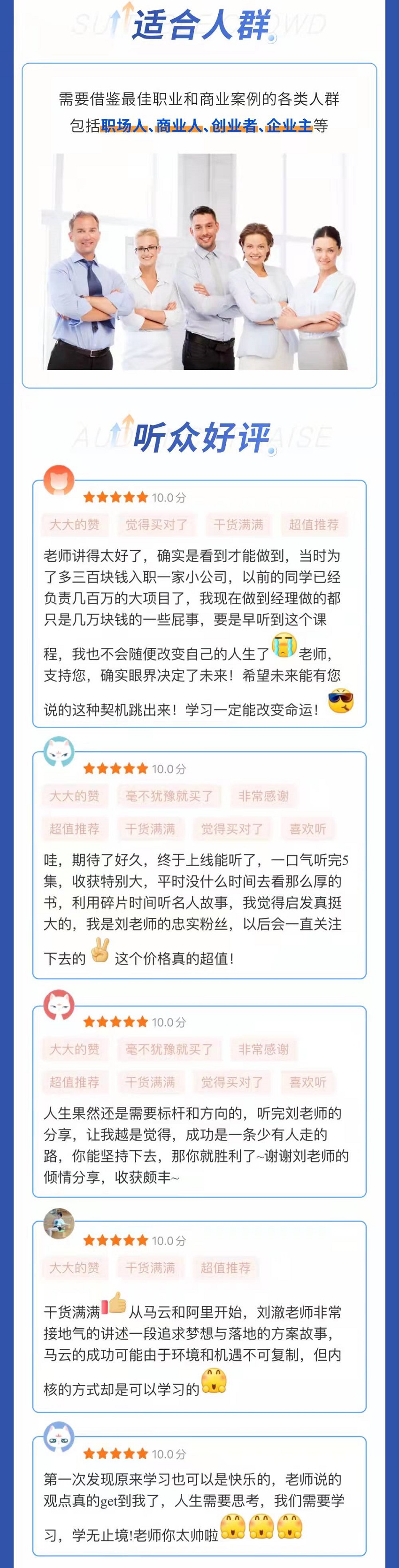需要借鑒最佳職業(yè)和商業(yè)案例的各類(lèi)人群包括職場(chǎng)人、商業(yè)人、創(chuàng)業(yè)者、企業(yè)主等