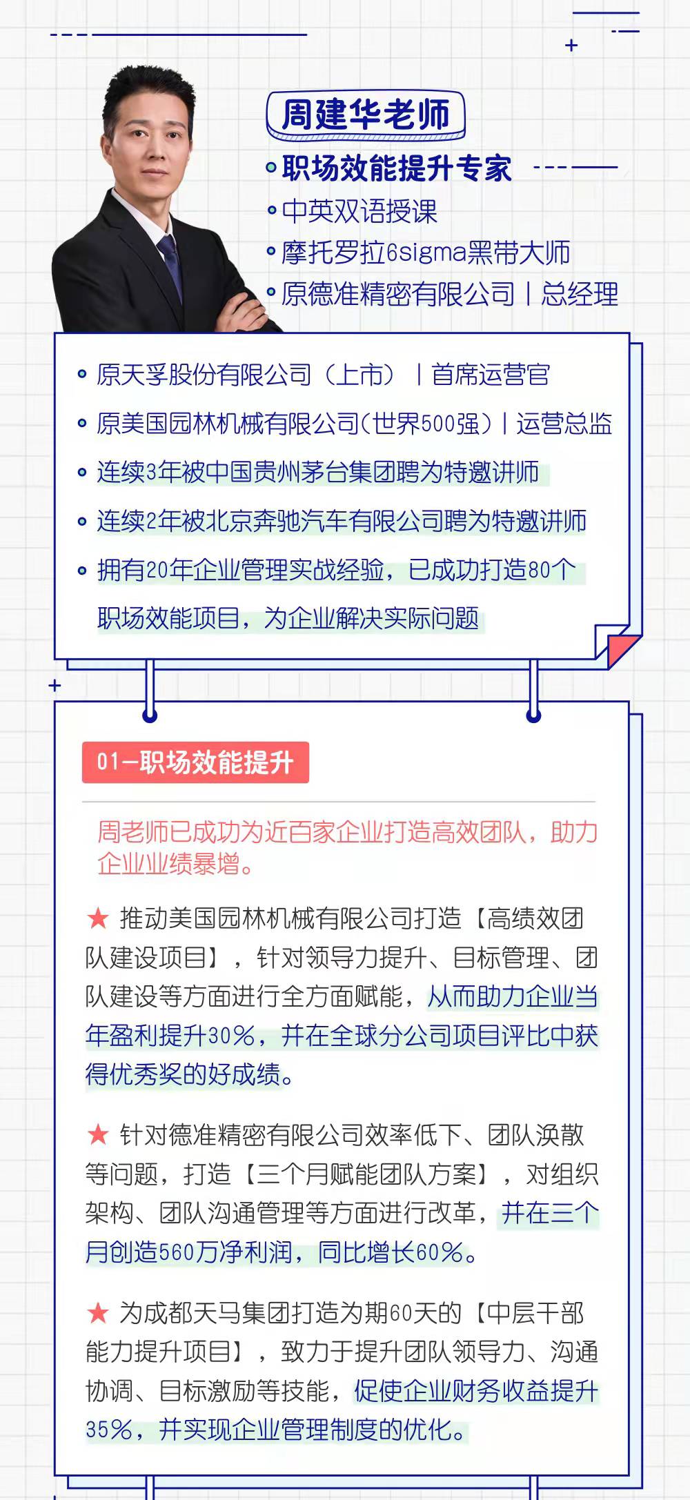 。連續(xù)2年被北京奔馳汽車有限公司聘為特邀講師。擁有20年企業(yè)管理實(shí)戰(zhàn)經(jīng)驗(yàn),已成功打造80個(gè)