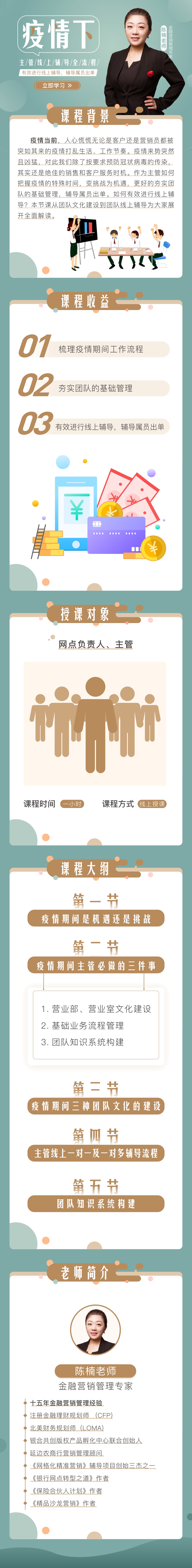 疫情當(dāng)前,人心慌慌無論是客戶還是營銷員都被突如其來的疫情打亂生活、工作節(jié)奏。疫情來勢突然且兇猛,對此我們除了按要求預(yù)防冠狀病毒的傳染,其實(shí)還是絕佳的銷售和客戶服務(wù)時(shí)機(jī)。作為主管如何把握疫情的特殊時(shí)間,變挑戰(zhàn)為機(jī)遇,更好的夯實(shí)團(tuán)隊(duì)的基礎(chǔ)管理,輔導(dǎo)屬員出單。如何有效進(jìn)行線上輔導(dǎo)?本節(jié)課從團(tuán)隊(duì)文化建設(shè)到團(tuán)隊(duì)線上輔導(dǎo)為大家展開全面解讀。