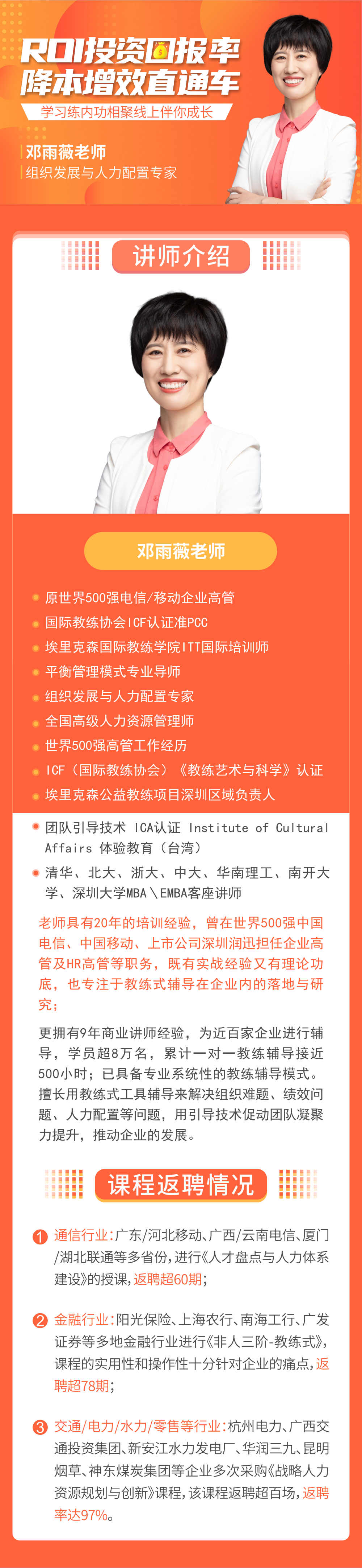 老師具有20年的培訓經(jīng)驗,曾在世界500強中國電信、中國移動、上市公司深圳潤迅擔任企業(yè)高管及HR高管等職務,既有實戰(zhàn)經(jīng)驗又有理論功底,也專注于教練式輔導在企業(yè)內(nèi)的落地與研究;