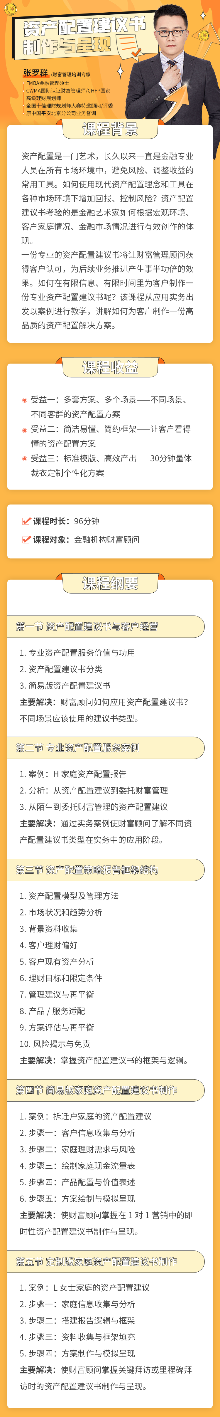 一份專業(yè)的資產(chǎn)配置建議書將讓財富管理顧問獲得客戶認(rèn)可,為后續(xù)業(yè)務(wù)推進(jìn)產(chǎn)生事半功倍的效果。如何在有限信息、有限時間里為客戶制作一份專業(yè)資產(chǎn)配置建議書呢?該課程從應(yīng)用實務(wù)出發(fā)以案例進(jìn)行教學(xué),講解如何為