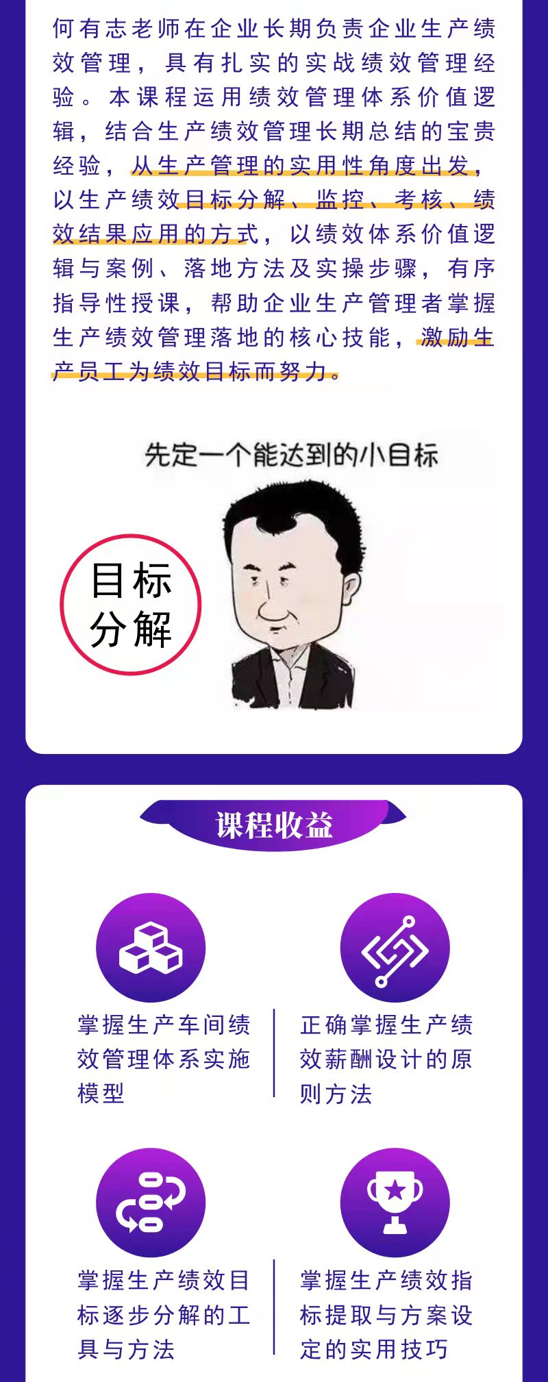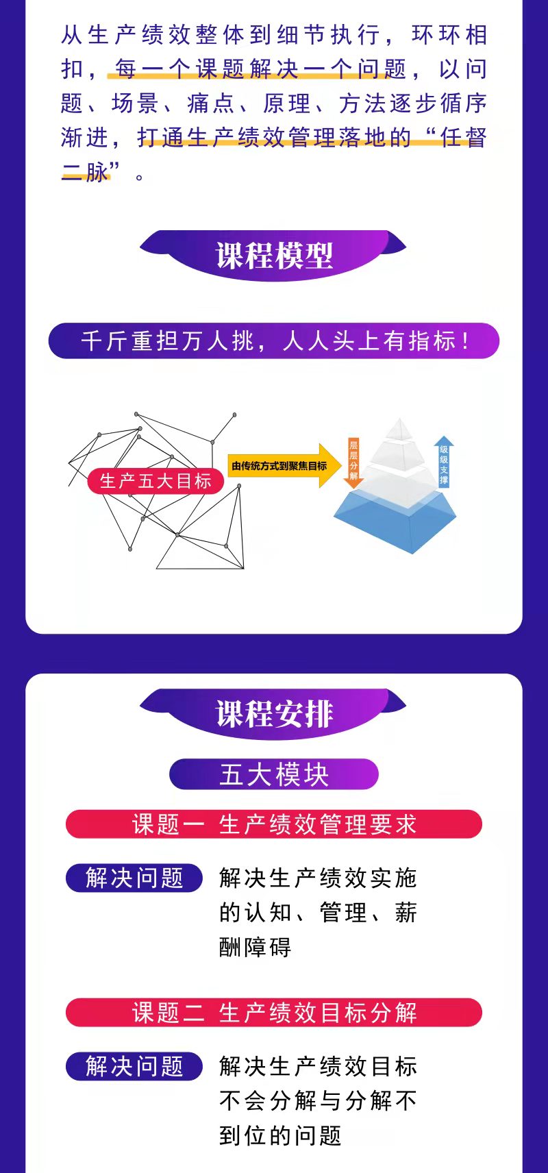 從生產(chǎn)績效整體到細節(jié)執(zhí)行,環(huán)環(huán)相扣,每一個課題解決一個問題,以問題、場景、痛點、原理、方法逐步循序漸進,打通生產(chǎn)績效管理落地的“任督二脈”