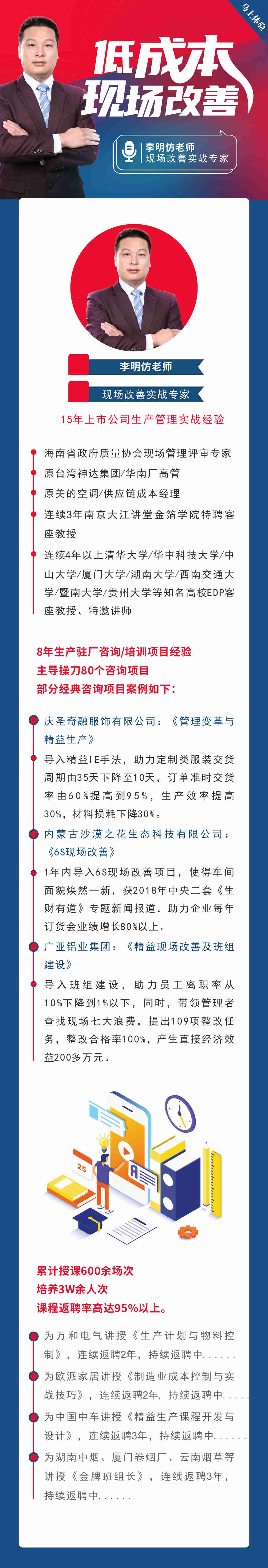 為歐派家居講授《制造業(yè)成本控制與實戰(zhàn)技巧》,連續(xù)返聘2年,持續(xù)返聘中.. 為中國中車講授《精益生產(chǎn)課程開發(fā)與設(shè)計》,連續(xù)返聘3年,持續(xù)返聘中... 為湖南中煙、廈門卷煙廠、云南煙草等講授《金牌班組長》,連續(xù)返聘3年,持續(xù)返聘中.....