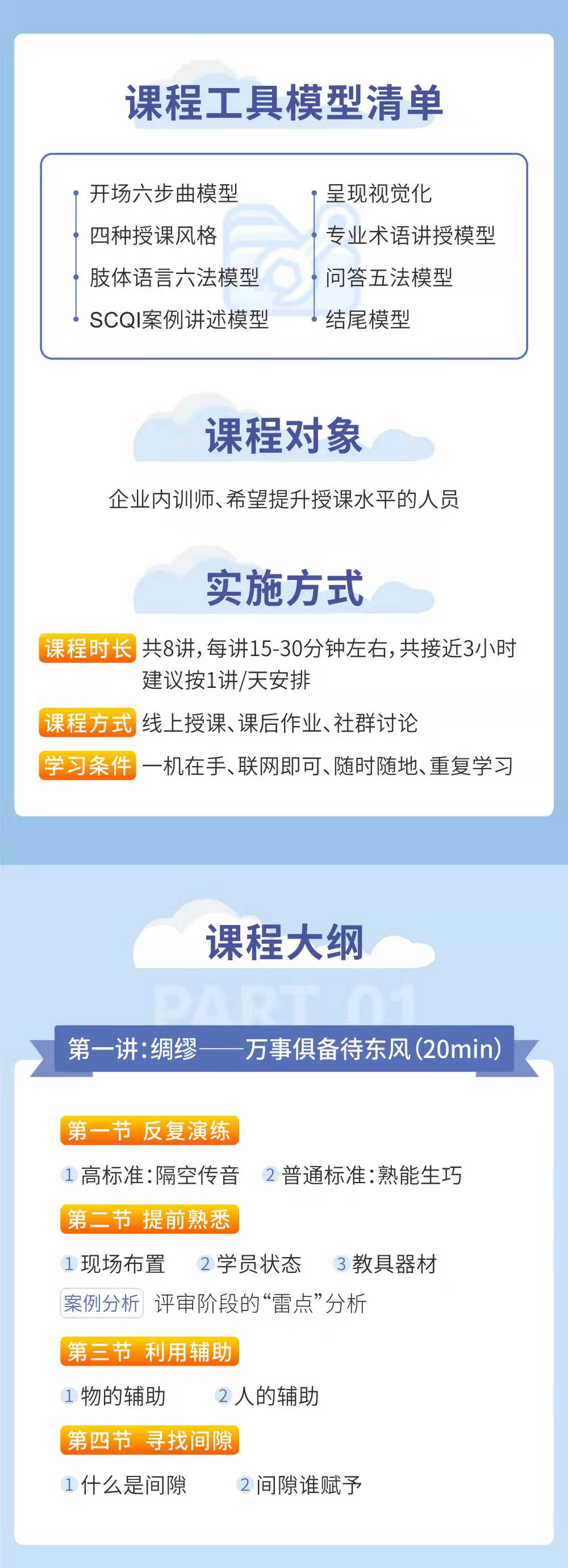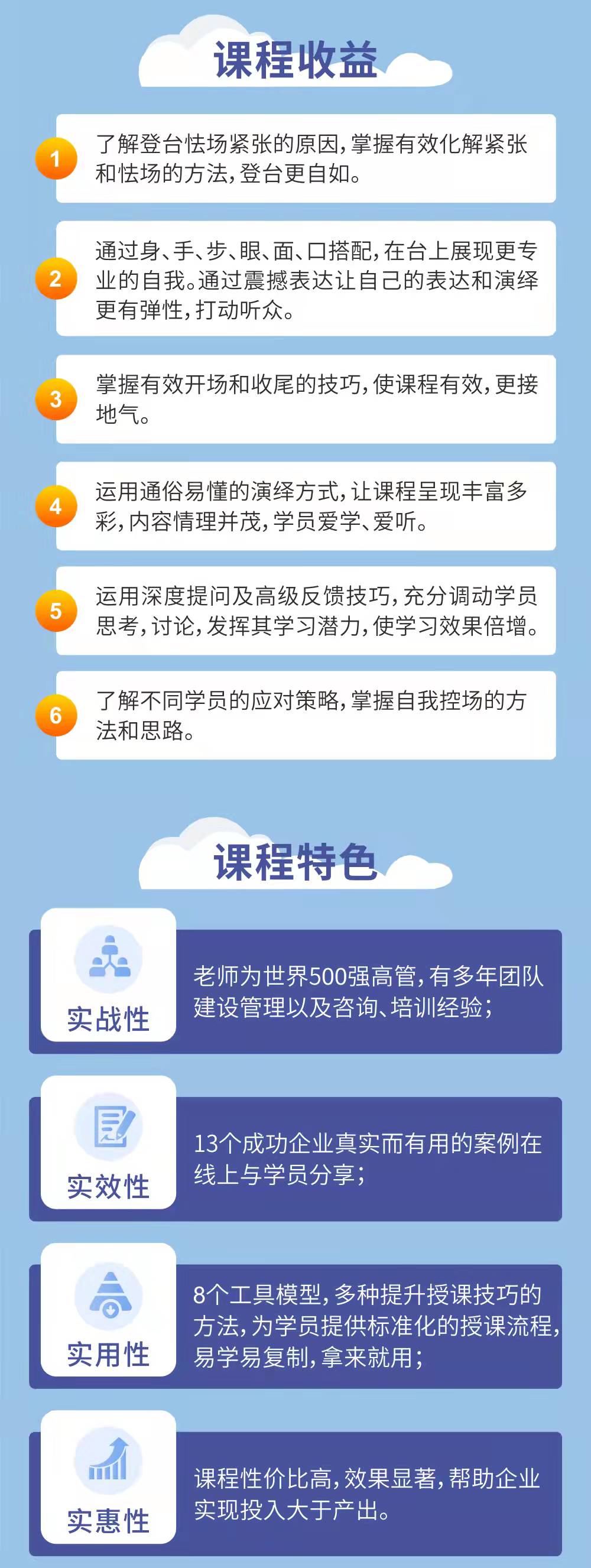 老師課程內(nèi)容全面涵蓋授課技巧、課程開(kāi)發(fā)、課件制作、微課設(shè)計(jì)、培訓(xùn)管理五大領(lǐng)域,并承諾現(xiàn)場(chǎng)產(chǎn)出、優(yōu)化課程;