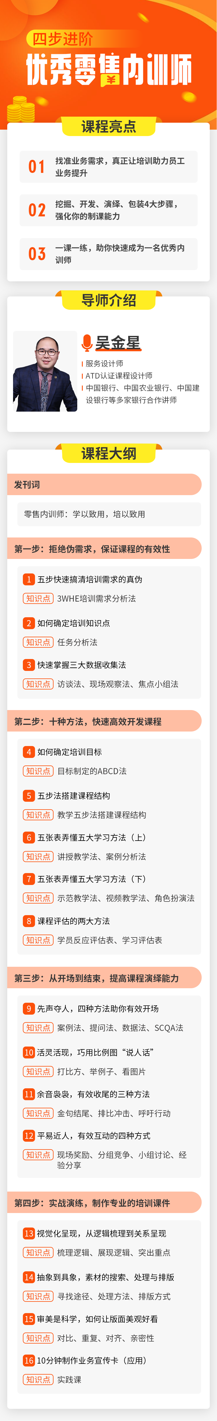 01找準業(yè)務需求,真正讓培訓助力員工業(yè)務提升 02挖掘、開發(fā)、演繹、包裝4大步驟,強化你的制課能力 03一課一練,助你快速成為一名優(yōu)秀內訓師