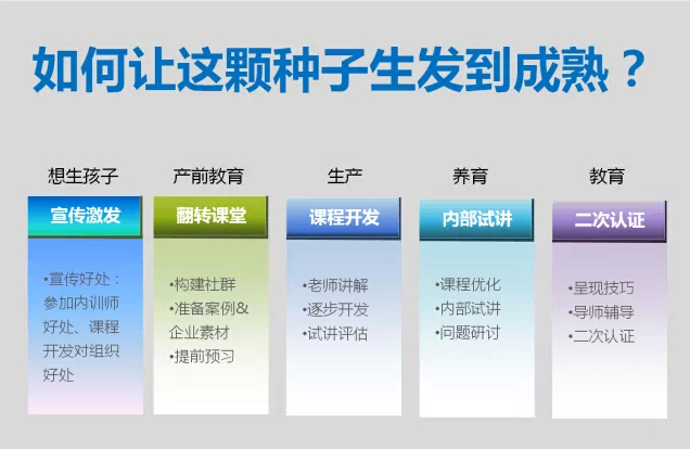 試管嬰兒模式:外面有一些課程的素材和胚胎,內(nèi)訓師自己根據(jù)這些素材來進行內(nèi)化(孕育),然后再生產(chǎn)。這樣的好處是讓內(nèi)訓師可以多了解外面的標準化知識。