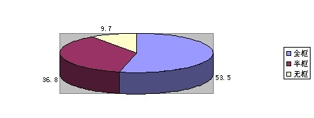 通過調(diào)查發(fā)現(xiàn),參與調(diào)查的144人中有53.5%的人選擇全框,36.8%的人選擇半框,9.7%的人選擇無框,可以看出全框和半框的市場很大,占了90.3%的比例。