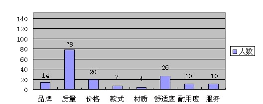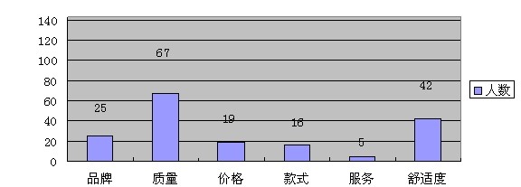 通過調(diào)查發(fā)現(xiàn),在參與調(diào)查的151人中,消費者在購買時考慮因素的選擇中,在首先考慮因素中,居于首位的是質(zhì)量,這類人有78個人,首先考慮舒適度和價格的要相對較低,而且差距很明顯,分別只有26人和20人,在其余的因素中,消費者考慮的都較少。