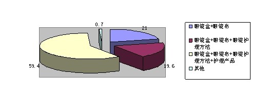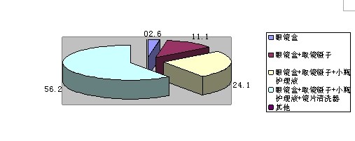 (5)在隱形眼鏡包裝上看:通過調(diào)查,在隱形眼鏡包裝中,大多數(shù)的人喜歡有眼鏡盒,取鏡鑷子,小瓶護理液和鏡片清洗器,少數(shù)的人選擇了眼鏡盒。由此看出在包裝中消費者的要求較高。