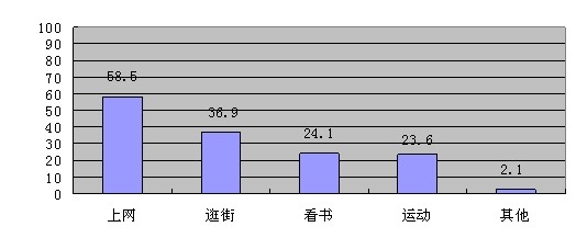 通過調(diào)查發(fā)現(xiàn),有58.5%的學(xué)生的課余愛好是上網(wǎng),36.9%的學(xué)生的課余愛好是逛街,這兩類的學(xué)生所占的比重較大,也有一部分的學(xué)生的課余愛好是看書和運動,這類學(xué)生的比重分別占了24.1%和23.6%,只有少量一部分學(xué)生選擇了其他,僅有2.1%,說明學(xué)生對上網(wǎng)和逛街還是比較喜愛的。