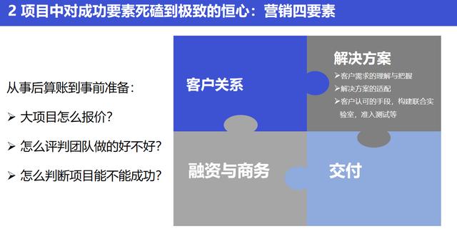 三心(面向市場和客戶,導向沖鋒和進攻)是指:對機會逢單快速切入的決心、項目中對成功要素死磕到極致的恒心、打開每一個關(guān)鍵節(jié)點控制的細心